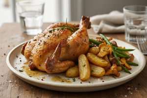 Roasted Half Chicken with Fingerling Potatoes, Mushrooms & Green Beans Serves: 2Prep Time: 15 minutesCook Time: ~1 hour 15 minutesTotal...
